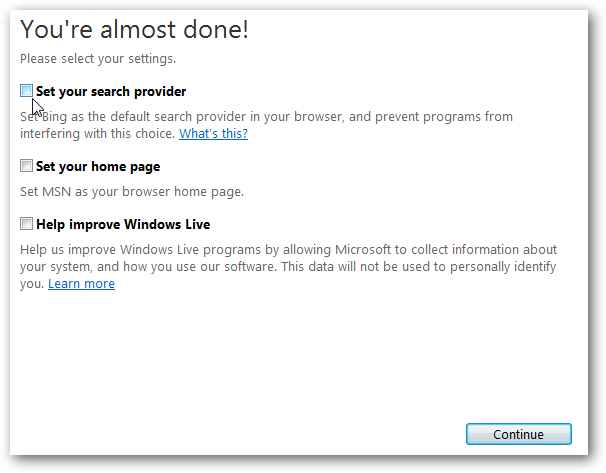 Обязательно снимите флажок Настройка вашей домашней страницы в MSN и настройках поиска поставщика,таких как Bing, если вы не хотите, чтобы они изменились.
