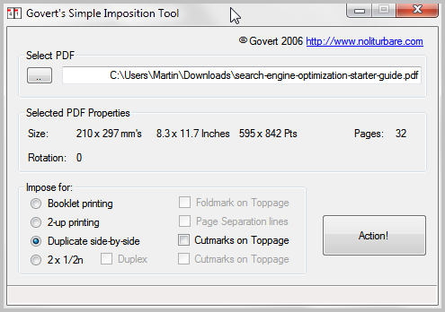Нажмите на кнопку действий, запускается файл сохранить окно, в котором вы можете ввести название для нового документа PDF. Если сравнить варианты Adobe Reader, вы заметите, что некоторые из них поддерживаются продуктом Adobe. Вы можете использовать программу Adobe Reader для печати нескольких страниц на одном листе и в виде брошюры. Но не поддерживается возможность печати одной страницы несколько раз на листе, а также возможность размещения первой половины документа бок о бок со второй половиной. Программа Simple Imposition Tool доступна для ПК под управлением Windows. Она требует Microsoft. NET Framework 2.0. Программа была протестирована под 64-разрядной версией Windows 7 Professional. Simple Imposition Tool работала без изъянов.
