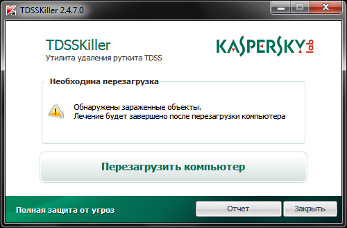 # Когда работа закончена, программа предложит перезагрузку для завершения дезинфекции.Процесс будет выполнять все запланированные операции и убивать себя при следующей перезагрузке системы.