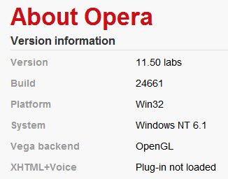 Существующие Opera пользователи должны установить релиз Opera 11.50.24661, в другой каталог (как портативные установки), чтобы избежать осложнений с уже установленной копией веб-браузера Opera. Обратите внимание, что Opera выпустила версию только для Windows. Пользователи Opera могут проверить,включено аппаратное ускорение или нет, введя в адресной строке about:opera . OpenGL под Вега Backend означает, что аппаратное ускорение включено и браузер использует встроенное аппаратное ускорение.