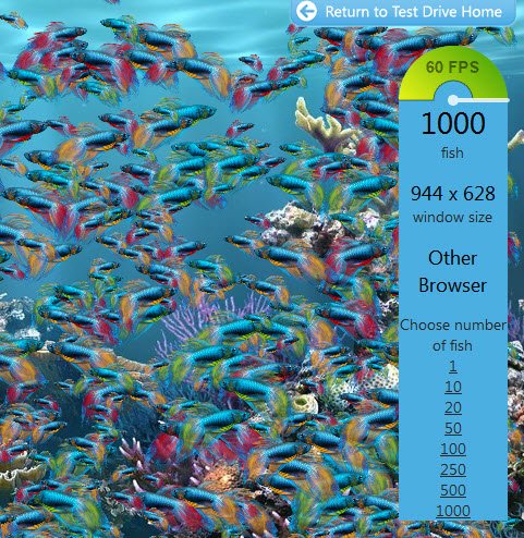 Перед запуском тестов,рекомендуется обновление драйвера графики до последней версии.Как узнать быстроту Опера 11.50 с аппаратным ускорением? Давайте посмотрим на картинку рыб от Microsoft демо с 1000 рыбами. Обратите внимание, что кадры зависят как от реализации браузера,так и аппаратных компьютерных систем. максимальная ФСИН испытаний 60.