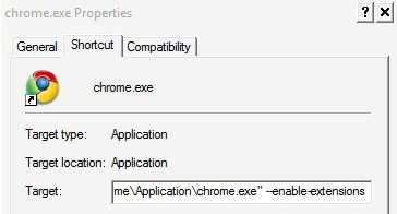 Самый простой способ начать работу с включенным расширениями в браузере Google, это добавить параметр в ярлык программы. Вам просто нужно добавить параметры (с пробелом между окончанием «пути) в целевую область.