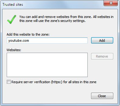 Все, что вам нужно сделать, это ввести в формы youtube.com «Добавить узел в зону», снимите флажок «Требовать проверка серверов (HTTPS:) для всех сайтов в этой зоне» и нажмите на кнопку Добавить.