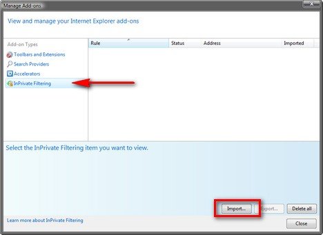 В окне Управление надстройками , нажмите на InPrivate Filtering , а затем на Импорт .