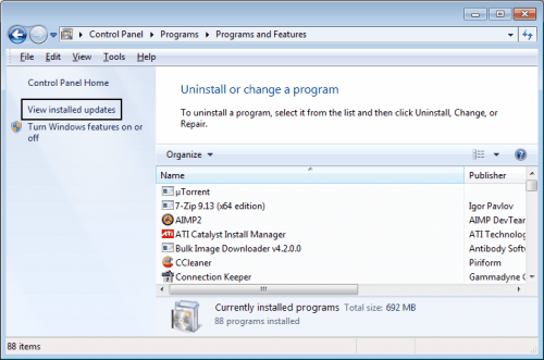 Windows заполняет список всеми программами, которые были установлены пользователем системы. Как я уже отмечал ранее, Internet Explorer 9 не установлен, как программа, а как обновление. Именно по этой причине он не в числе установленных программ.Для удаления Internet Explorer 9 щёлкните ссылку в верхнем левом углу экрана Просмотр установленных обновлений. Открывается список обновлений Microsoft, которые были установлены на компьютер.