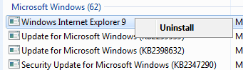 Щёлкните правой кнопкой мыши на Windows Internet Explorer 9 и выберите из контекстного меню удалить.