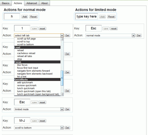 Каждый контекст состоит по крайней мере из одного ключа и действия. Действия предоставляются в раскрывающемся листинге. Среди них есть такие действия -скопировать URL и / или название сайта различными способами, чтобы сосредоточить различные элементы на странице, прокрутка связанных ярлыков, вкладки и навигационные клавиши или клавиши загрузки страницы.