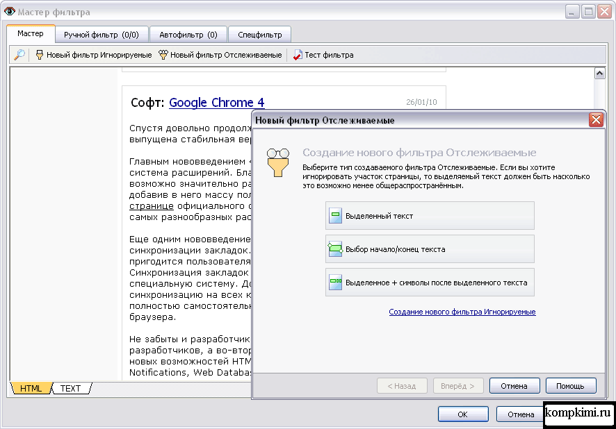 Программа может похвастаться мощнейшей системой фильтров, благодаря которой можно весьма тонко настроить все условия отслеживания изменений на сайтах. Такие фильтры работают по принципу включения/исключения текста находящегося на странице. Если интересует определенный отрезок веб-страницы, то можно настроить отслеживание только его, а прочее содержание игнорировать во избежание ложных срабатываний при проверке.