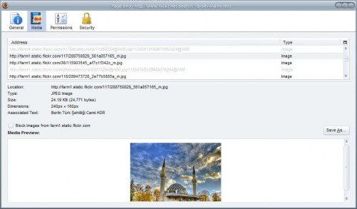 Вкладка Media более интересна, потому что она обеспечивает доступ к функции «Сохранить». Она показывает все объекты, которые были загружены с сайта, который включает в себя изображения и HTML файлы. Превью изображений приведены в той же вкладке, и есть возможность сохранить всё содержимое легко на жесткий диск, выбрав всё и нажав на кнопку Сохранить как.