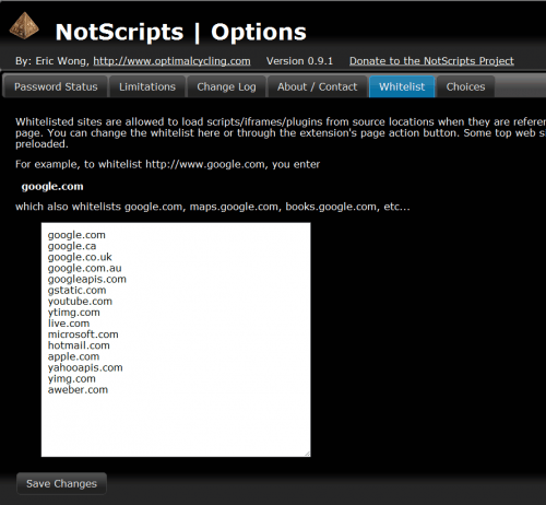 Когда вы посещаете веб-сайт в первый раз с включенной поддержкой сценариев, вы можете увидеть как  NotScripts перезагружает его один раз,потому что он кэширует белый список. Впоследствии, нет необходимости перезагрузки, если вам случится изменить часть «белого списка»,который непосредственно влияет на сайт. Это только незначительная проблема, и происходит она всё меньше и меньше, так как NotScripts узнает желаемый белый список.