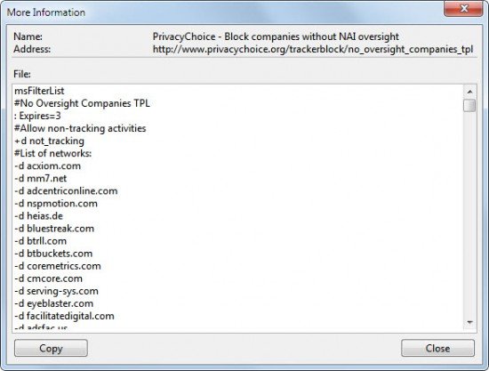 Списки используют текстовый формат. Пользователи Internet Explorer 9 могут посмотреть на их содержание, перейдя к инструментам> Безопасность> Отслеживание защиты. Щёлкните правой кнопкой мыши по установленному списку и выберите дополнительную информацию, открывается список скриптов, которые заблокированы или разрешены.