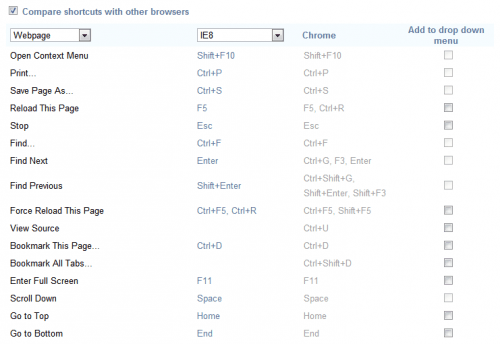 Списки клавиш, доступные в браузере Chrome, разделены на группы, такие как вкладки и окна, веб-страницы или адреса с возможностью сравнить ярлыки с веб-браузерами, такими как Firefox,Opera или Internet Explorer .