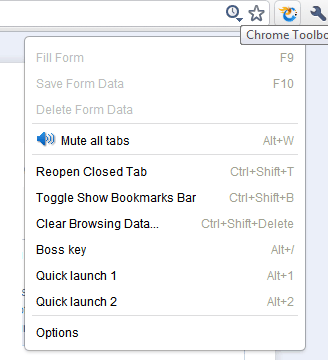 Chrome Toolbox это новое расширение для браузера Chrome , которое направлено на повышение производительности различными способами. После установки расширения Chrome Toolbox станут доступны все возможности. Щёлкните правой кнопкой мыши на новом значке в адресной строке Chrome и выберите варианты Параметры страницы Chrome Toolbox .Эта страница разделена на пять вкладок панели инструментов вкалдки,формы, панель быстрого запуска, ярлыки, меню и другие расширения.
