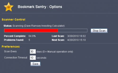 Расширение Bookmark Sentry добавляет опцию для сканирования закладок в браузере Chrome автоматически или вручную. По умолчанию интервал сканирования был установлен в 30 дней, что означает, что расширение будет автоматически проверять закладки которые хранятся в браузере каждые 30 дней.Интервал сканирования может быть настроен в настройках расширения. Руководство сканирования можно выполнить в настройках расширения так ,что бы расширение проверяло каждую закладку и отображало индикатор выполнения и количество проблемных закладок.Сканирование занимает некоторое время в зависимости от количества хранящихся в браузере Chrome закладок и скорости Интернет-соединения компьютера.