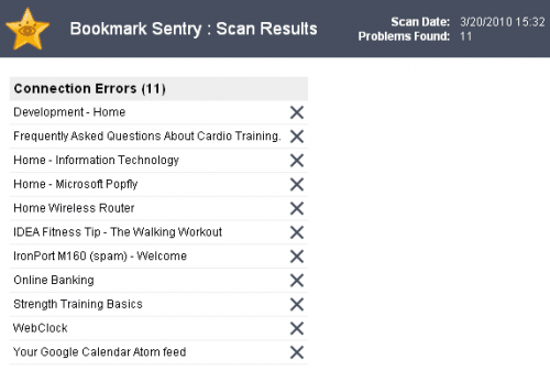 Закладки перечислены с их названиями и URL. Нажмите на закладку, открывается страница в веб-браузере для ручной проверки. X в конце каждой строки может быть использован для удаления закладки из базы данных. Bookmark Sentry является полезным расширением для веб-браузера Google Chrome, которое может регулярно и автоматически проверять закладки.