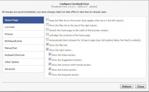 Популярные веб-сервисы такие как, Facebook, Gmail или Yahoo Mail, как правило, имеют в браузере дополнения и userscripts, что бы добавить или изменить функциональность непосредственно на веб-сайтах. Facebook Fixer является одним из первых расширений для веб-браузера Google Chrome.Расшиерние повышает удобство работы пользователей на Facebook. Это порт UserScript одного и того же имени. Расширение добавляет меню UserScript для настройки меню так, что открывается окно оверлея при активации.