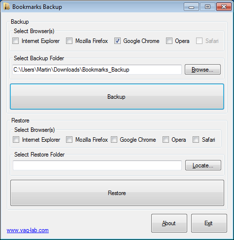 Bookmarks Backup резервное копирование закладок, как уже упоминалось ранее, будет не только делать резервное копирование закладок, но и другие данные. Для Firefox, Opera и Chrome,будет копировать всю папку профиля и хранить в хранилище. Для Internet Explorer Bookmarks Backup ,делает резервное копирование только избранного. Safari не был установлен, и я был не в состоянии проверить Bookmarks Backup , но я предполагаю, что резервная копия будет включать в себя полный профиль.Резервные копии могут быть восстановлены в том же интерфейсе в обратном порядке. Он начинается с выбора браузера и папки восстановления.Нажмите на восстановление и восстановится выбранная резервная копия для всех браузеров, которые были выбраны пользователем.