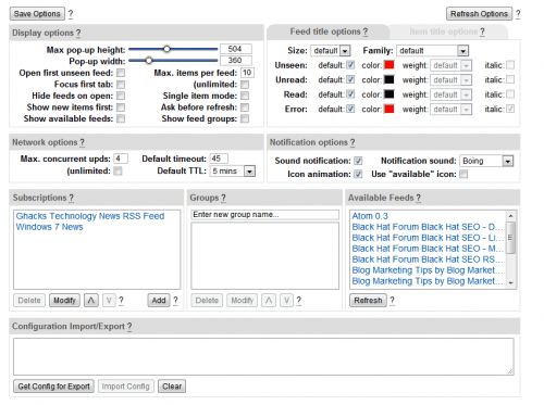 Существуют варианты конфигурации экспорта и импорта, но, к сожалению, не для OPML файлов. Пользователи Chrome должны нажать на кнопку Сохранить настройки до изменения когда каналы становятся видимыми в обозревателе.