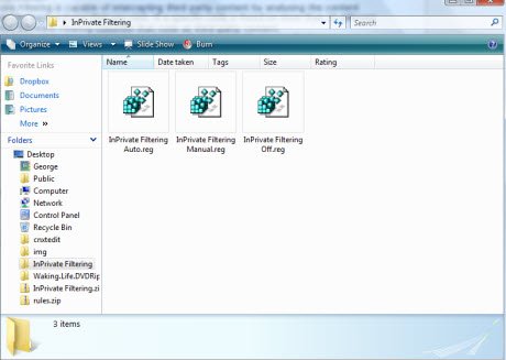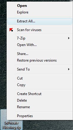 Когда вы откроете папку, в которую был извлечён архив, вы увидите три файла: InPrivate Filtering Auto, InPrivate Filtering Manual и InPrivate Filtering Off .