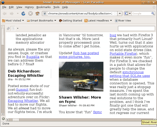 В Snowl действительно есть несколько проблем, которые я испытал при установке Live Bookmarks в Firefox. Импорт RSS-каналов новостей практически тормозит систему . Это очень печально, если вы импортируете сотни каналов из файла OPML. То же самое происходит, если вы обновляете каналы внешних приложений или он-лайн услуги, таких как Google Reader.