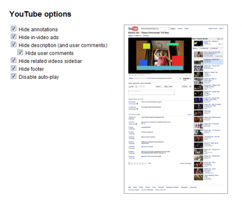 Расширение Youtube Options для Google Chrome предоставляет опции для отключения конкретного содержания блоков Youtube так, чтобы они не отображаются на портале видео хостинга.Расширение Youtube Options имеет иконку в адресной строке Chrome, если страницы Youtube видео открывается в браузере.Нажав эту ссылку откроется образ страницы Youtube видео. Затем пользователь может нажать на элементы, чтобы их отключить для этого видео.Ниже просмотр видео, где все элементы на странице были удалены, так что осталось только видео, название и заголовок.