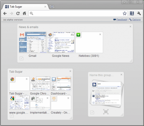 Firefox Panorama новая особенность браузера Firefox 4, который предлагает различные способы управления вкладками в браузере. Среди особенностей есть варианты групп вкладок, отображение всех открытых вкладок на одном экране и отображать только выбранные наборы вкладок TabBar браузера. Tab Sugar основная особенность Firefox 4 теперь есть и в Google Chrome. Она ещё находится в альфа развитии, но она предлагает впечатляющий набор функций.