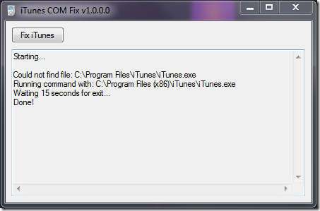 ITunes COM-Fix это маленькое приложение, которое быстро зарегистрирует новый исполняемый COM-объект. Теперь каждое приложение, которое работает с использованием API ITunes будет снова начинать работать без переустановки.