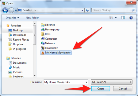 16.Найдите файл, который только что создали в HandBrake, выберите ее и нажмите Открыть — Open.