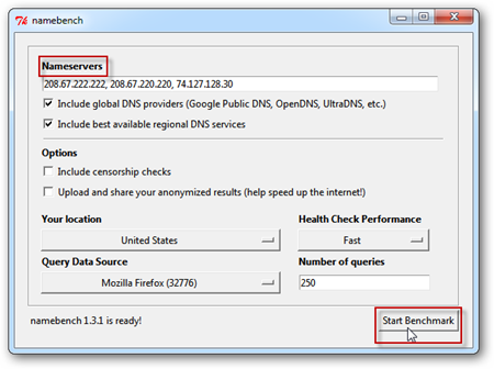 2.Когда вы впервые стартуете Namebench, вы увидите, OpenDNS, возможность включать Google Public DNS, и ваш локальный IP-адрес DNS-сервера. По словам разработчиков, параметров по умолчанию должно быть достаточно для большинства пользователей. Просто нажмите кнопку Пуск тестов — Start benchmark.