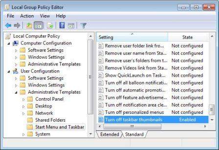 - Найдите и дважды щелкните на панели задач Выключить миниатюры в правой части окна редактора локальной групповой политики.