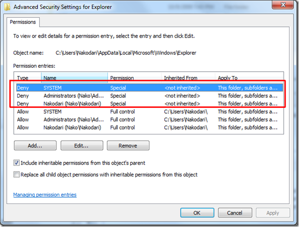 Для каждого пользователя, нажмите кнопку Изменить и установите флажок Запретить для: `Удалить подпапки и файлы «и» Удалить «, как показано на рисунке ниже.