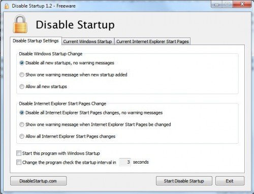 Основное применение Disable Startup ,является отключение всех новых записей и запуска Internet Explorer. Новые записи автоматически блокируются без предупреждения. Пользователи, которые предпочитают больше контроля над операционной системой ,могут изменить настройки по умолчанию, так что предупреждения отображаются, когда программа пытается добавить новую запись запуска или изменения в странице запуска Internet Explorer.