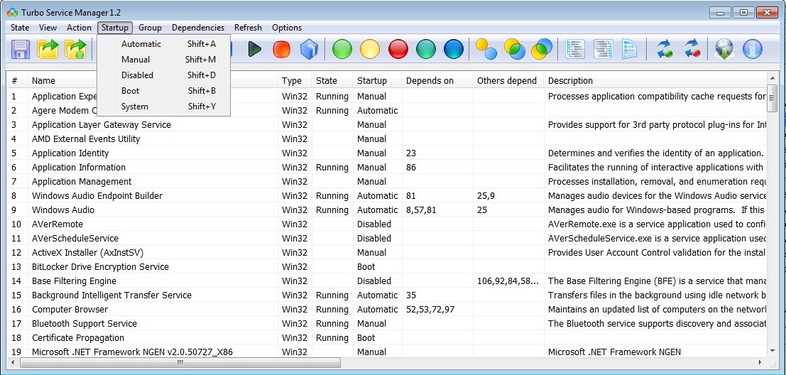 Работа с Turbo Services Manager стала намного легче, потому что она обеспечивает быстрые клавиши для наиболее важных действий. Можно запускать, останавливать, возобновлять, удалить и сделать паузу услуг с клавиатуры. То же самое верно для изменения типа запуска сервиса. Одной из интересных особенностей Turbo Services Manager ,является возможность выбора нескольких услуг одновременно и применить действие ко всем из них сразу. То, что не возможно при работе с services.msc.
