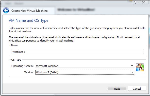 Теперь вы должны ввести имя виртуальной машины и выбрать тип операционной системы. Из выпадающего меню вам нужно выбрать для Windows 8 32-бит, выберите » Windows 7 «, а для 64-разрядной версии Windows 8 выберите Windows 7 (64 бит).