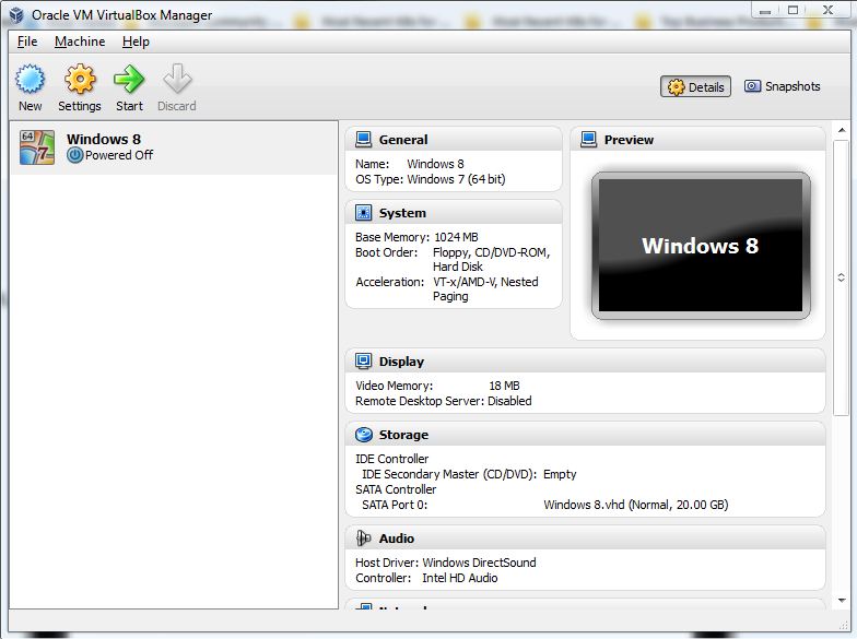 Скачать разработку издания Windows 8 DP и VirtualBox Oracle (Windows Host). Затем установите VirtualBox на компьютере. Затем откройте приложение