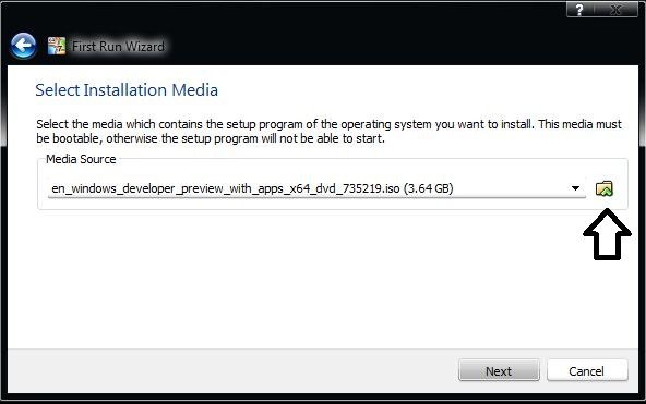 Теперь вам нужно выбрать установочный диск, если у вас Windows 8 на диске , выберите диск, либо нажмите кнопку Обзор и выберите образ ISO. Если нет, то выберите устройства > CD / DVD устройства> Выберите загруженный файл ISO.