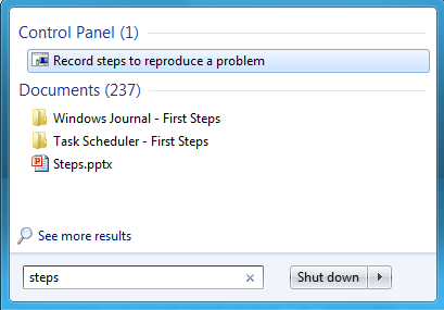 Чтобы открыть его в Windows 7, просто сделайте поиск по слову Steps в Меню » Пуск» поиск и нажмите на результаты, которые говорят «Запись шагов, чтобы воспроизвести проблему».