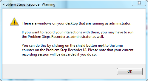 Когда вы запустите Problem Steps Recorder в Windows 7, вы можете быть предупреждены, что открыты некоторые окна на рабочем столе,с которыми вы работаете как администратор.