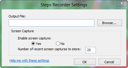 Чтобы убедиться, что запись правильная,вы должны использовать в меню Помощь «Запустить как администратор» . В варианте Настройки в меню Помощь появится маленькое окно, в котором вы можете установить, где ваша запись будет сохранена, если вы хотите включить захват экрана и сколько последних захватов программа должна хранить. Если вы собираетесь записывать длительную процедуру, не стесняйтесь изменить номер с 25 по более высокий.