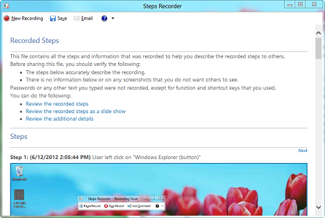 В Windows 8, после остановки записи, вы можете просмотреть его в Steps Recorder и выбрать сохранить и отправить его только после того, как вы удовлетворены.
