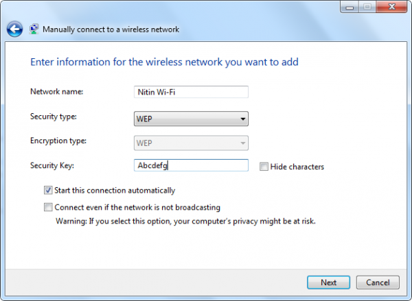 Открытая система аутентификации не является очень безопасной, общий ключ аутентификации является наименее защищенным из двух. Хакер может легко взломать ее, используя некоторые беспроводные инструменты анализа сети. По этой причине в Windows 7 не поддерживается автоматическое создание сети с помощью WEP ключа аутентификации.