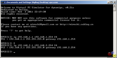 Для получения справки наберите в командной строке ? . VPCS поддерживает до девяти персональных компьютеров. Просто введите номер для переключения на другой компьютер. Используйте команду Показать для просмотра IP-PC или MAC-адреса. Чтобы назначить IP-адрес, маску подсети и шлюз по умолчанию на компьютере, выполните этот формат в командной строке.