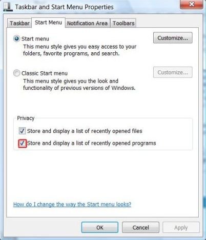 Если вы просто хотите очистить список последних запущенных программ, нажмите кнопку Применить. Затем проверьте вариант (отметьте снова) хранить и отображать список недавно открытых программ, и нажмите кнопку ОК.