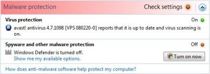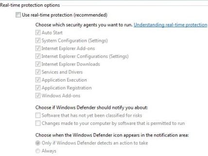 Обратите внимание, что оба варианта должны быть сняты для службы Windows Defender в Windows Vista, чтобы полностью остановить защиту. В противном случае, будет отключена только постоянная защита .