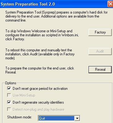 После того как все было создано (подготовительные действия, описанные в предыдущем разделе), вы готовы запустить Sysprep. Для этого перейдите в папку Sysprep и дважды щелкните на утилиту Sysprep.В зависимости от Вашего целевого компьютера (различные сценарии обсуждаются здесь в деталях: http://support.microsoft.com/kb/302577 , в разделе «Параметры средства Sysprep»),довольно просто вы найдете GUI версию Sysprep . Пример реализации может быть таким:
