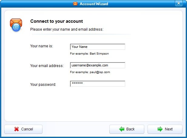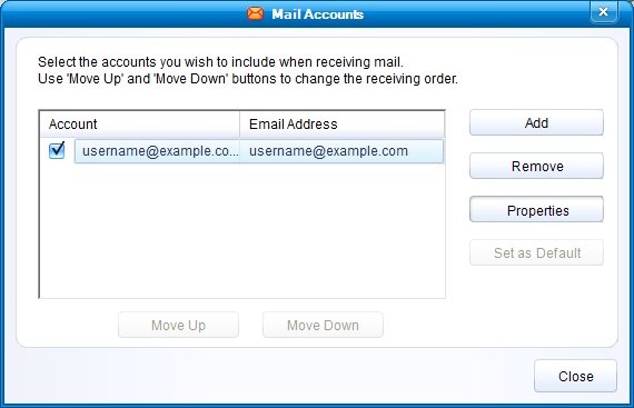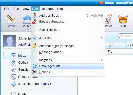 Для настройки почтового клиента IncrediMail ,что бы отправлять и получать электронную почту с помощью серверов, используя POP3 и SMTP через SSL, нужно выполнить следующие действия (замените username@example.com на свой адрес электронной почты и example.com с Вашим доменным именем):