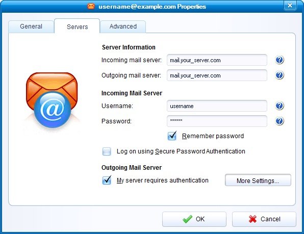 9.Нажмите «Servers» и проверте опции «My server requires authentication — Мой сервер требует проверки подлинности » .