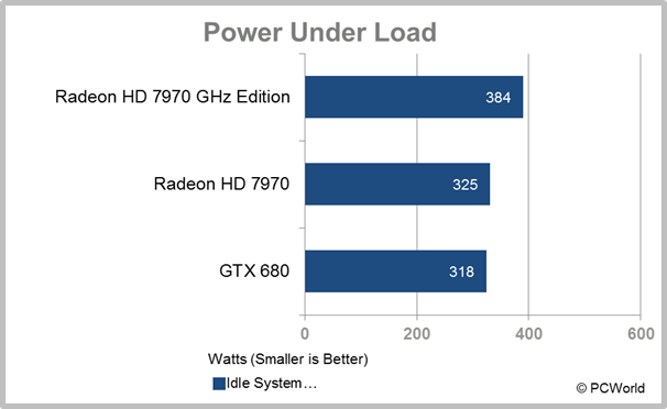 Архитектура не менялась,и AMD карта выглядит почти идентично, прямо на дисплее разъемы и вентилятор.Однако,PowerTune Boost,чем выше тактовая частота ядра,и чем быстрее памяти придёт,по стоимости — в то время как мощность в режиме ожидания на самом деле немного лучше,чем оригинал,на 120 Вт (против 124 ВТ в первой Radeon HD 7970), полная мощность нагрузки составляет колоссальные 384W,на 18% выше, чем 324W максимальной мощности на оригинальной HD 7970.GTX является более энергоэффективной,чем какие-либо другие видеокарты, 119W ожидания и 318W под нагрузкой.Обратите внимание,что издание HD 7970 ГГц  всё ещё использует тот же разъем,как и первая видеокарта 7970 — один 8-контактный разъем PCI Express,разъем питания и один 6-контактный разъем.Новое потомство AMD — уже 11 дюймов длиной,как и оригинал; обе половинки на дюйм больше,чем у GTX 680.