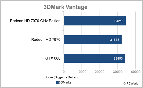 Nvidia GTX 680 имеет впечатляющую мозаику,которая отражается в 3DMark 2011 баллах.Это тот ориентир,который продемонстрировал значительное преимущество для GTX 680.В 3DMark Vantage тест использует DirectX 10, поэтому он ближе в этой отметке.