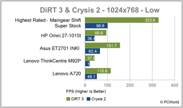 Ключевые характеристики всё-в-одном настольных компьютеров является их тонкий профиль.Такая система способствует тонкому 27-дюймовому монитору всё-в-одном 0.97-мм толщиной.Хотя он и чрезвычайно тонкий,он по-прежнему поставляется упакованный дискретной видеокартой Nvidia GeForce 630M с мобильным GPU на вершине Intel integrated graphics. Хотя,этого может быть достаточно для менее интенсивных игр,DiRT 3 и Crysis 2 отображается на максимальном разрешении 1920 на 1080 пикселей и едва удалось получить 29.8 кадров в секунду и 13.8fps, соответственно. A720 не удалось добраться до 60 fps в DiRT 3 с разрешением 1680 на 1050 пикселей и низкие параметры качества; но ближе он попадает на Crysis 2 на разрешении 1024 на 768, с низким качеством настройки-48.1fps.